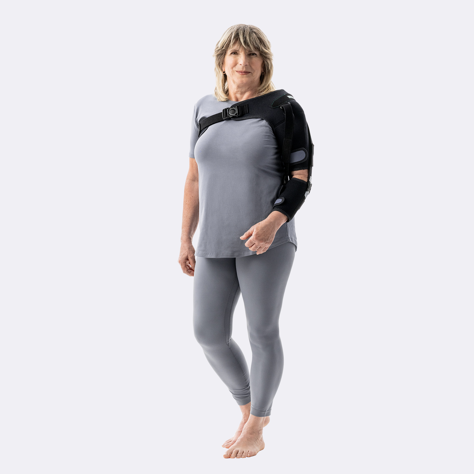 Die omosan Schultergelenkorthese passt sich durch das teilelastische Bandagenmaterial gut an den Körper an. Das schulterumfassende Material, das auf der anderen Seite über die Achsel mit einem Gurt befestigt wird, sorgt dafür, dass der Humeruskopf wieder in seine ursprüngliche Position